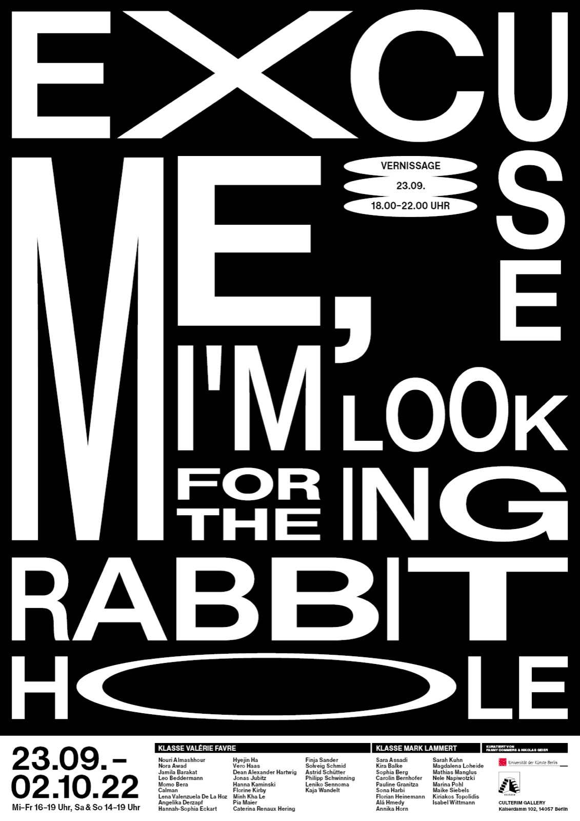 | 2022 | Berlin, culterim gallery, excuse me, i’m looking for the rabbit hole |